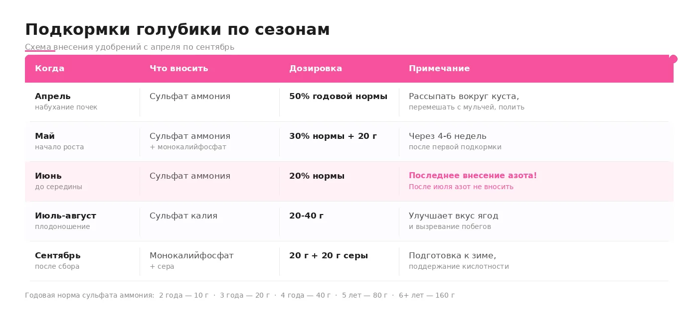 Весна (март-апрель). Снимите зимнее укрытие (если укрывали). Обрежьте сухие и повреждённые ветки. Проверьте pH почвы. Обновите мульчу до 7-10 см. Внесите первую подкормку сульфатом аммония при набухании почек.
